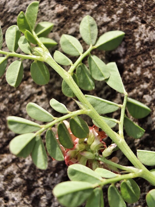 So now, two species remain. Indigofera caroliniana would have short, stumpy indehiscent fruits less than a centimeter long, each containing 2 or 3 seeds. Indigofera spicata would have longer fruits with an apparent seam and several seeds. I, however, have no fruits at all.